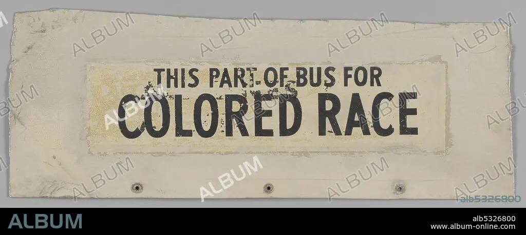 Caption: A metal bus sign with a stenciled black paint in black that reads: [THIS PART OF BUS FOR / COLORED RACE]. In 1960, students planned, coordinated and implemented protests against segregation in public facilities by orchestrating bus boycotts, picket lines and sit-ins. The protests forced the City of Nashville to integrate later that year, but sit-ins and demonstrations continued well into the 1960s in order to ensure compliance. Residue on the surface shows that the sign remained in place, pasted over by a different one.