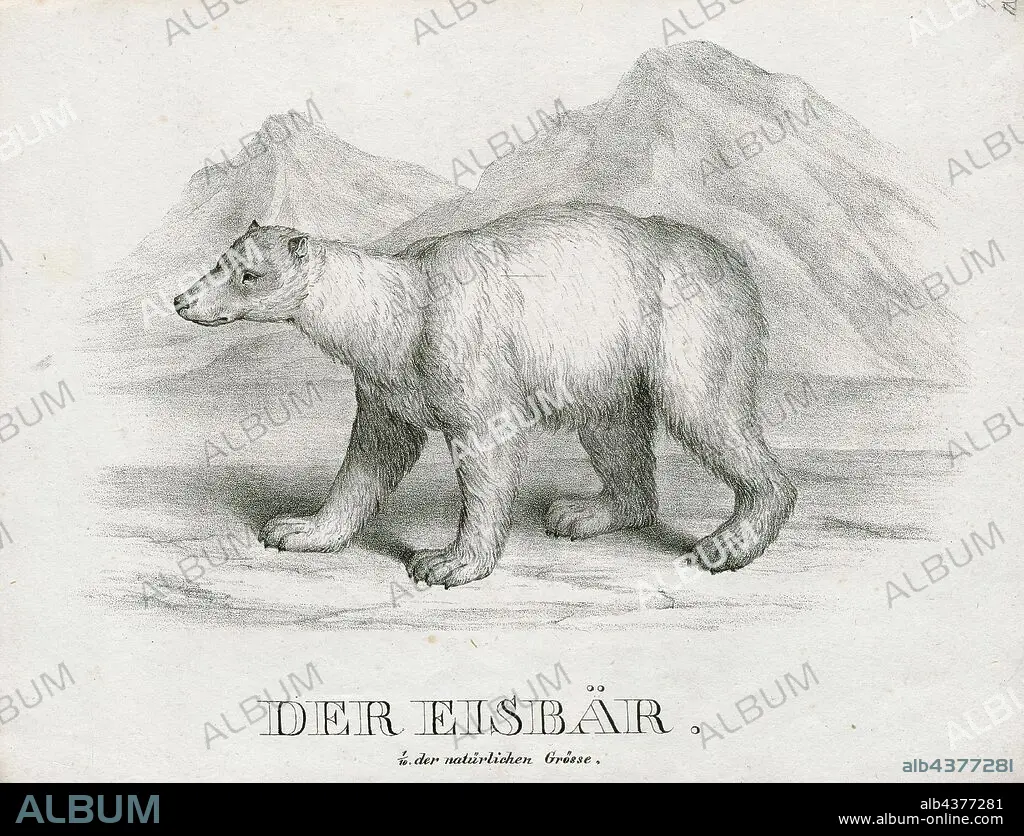 Caption: Ursus maritimus, Print, The polar bear (Ursus maritimus) is a hypercarnivorous bear whose native range lies largely within the Arctic Circle, encompassing the Arctic Ocean, its surrounding seas and surrounding land masses. It is a large bear, approximately the same size as the omnivorous Kodiak bear (Ursus arctos middendorffi). A boar (adult male) weighs around 350–700 kg (772–1, 543 lb), while a sow (adult female) is about half that size. Polar bears are the largest land carnivores currently in existence, rivaled only by the Kodiak bear. Although it is the sister species of the brown bear, it has evolved to occupy a narrower ecological niche, with many body characteristics adapted for cold temperatures, for moving across snow, ice and open water, and for hunting seals, which make up most of its diet. Although most polar bears are born on land, they spend most of their time on the sea ice. Their scientific name means "maritime bear" and derives from this fact. Polar bears hunt their preferred food of seals from the edge of sea ice, often living off fat reserves when no sea ice is present. Because of their dependence on the sea ice, polar bears are classified as marine mammals., 1700-1880