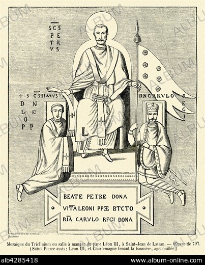 Caption: Mosaic of Triclinium or the from dining room of the Pope Leo III, depicting Saint-Jean de Latran (Saint Peter, Leo III and Charlemagne are depicted kneeling and holding the flag). 19th Century engraving.