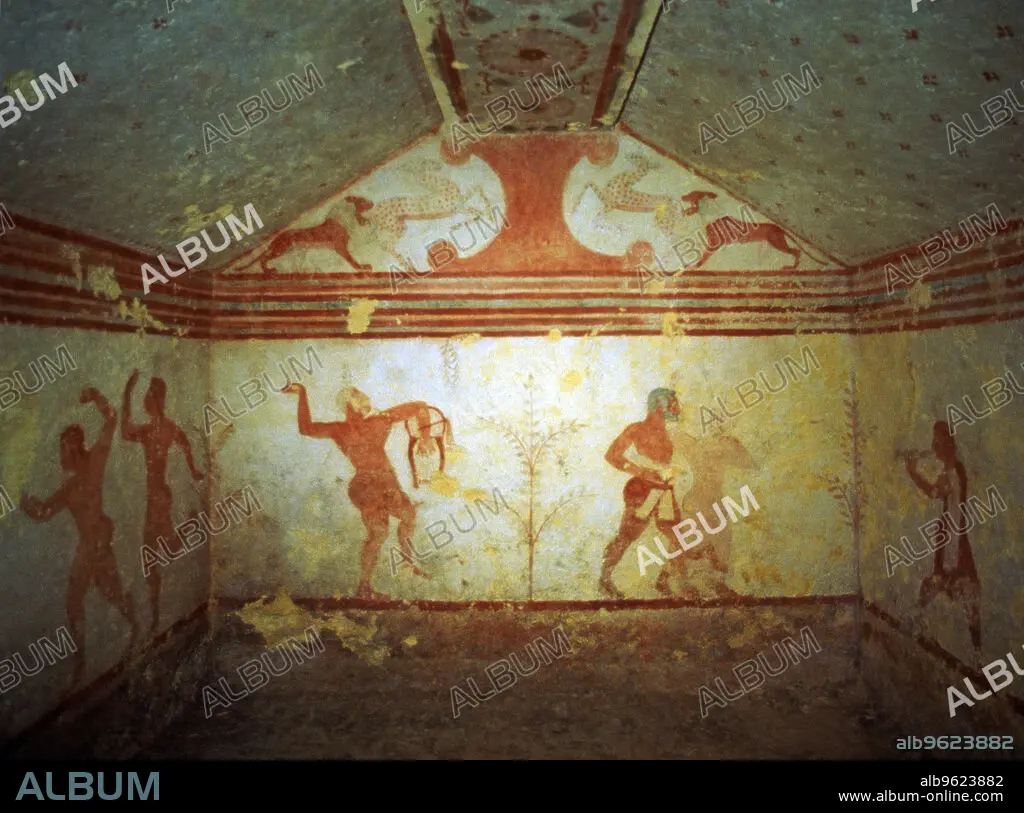 Caption: Frescoes in the Baccanti tomb in the necropolis of Montarozzi at Tarquinia.