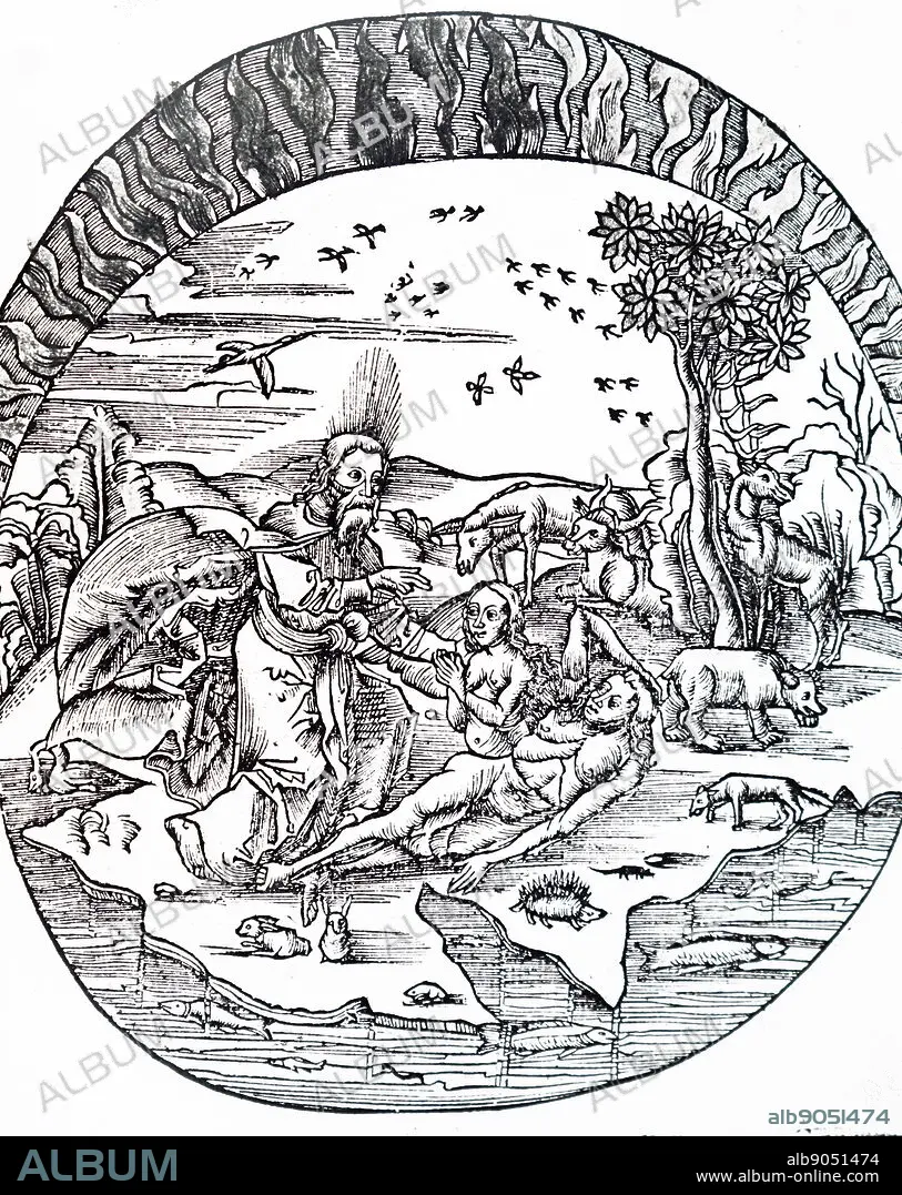 Caption: Illustration depicting Thales of Miletus' concept of a flat earth floating above water. Thales of Miletus, a pre-Socratic Greek/ Phoenician philosopher, mathematician, and astronomer. Dated 16th Century