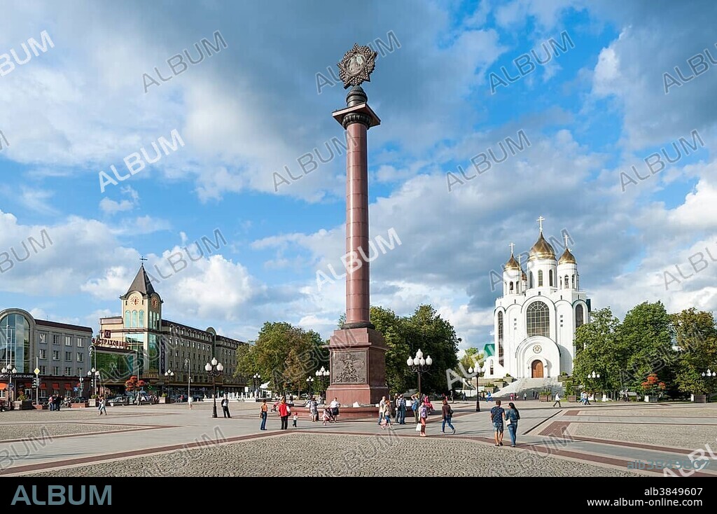 Caption: Victory Column with a stylized medal, World War II, Victory Square, Russian Orthodox Cathedral at the back, Centralnij rajon, Kaliningrad, Kaliningrad Oblast, Russia, Europe