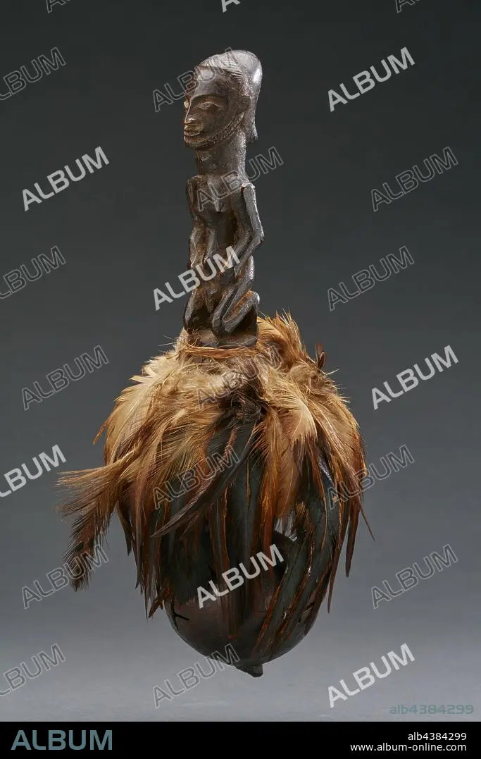 Caption: ritual rattle with human figure, Kusu, early 20th century, wood, gourd, feathers, fiber, H: 9-1/16 in., African Art