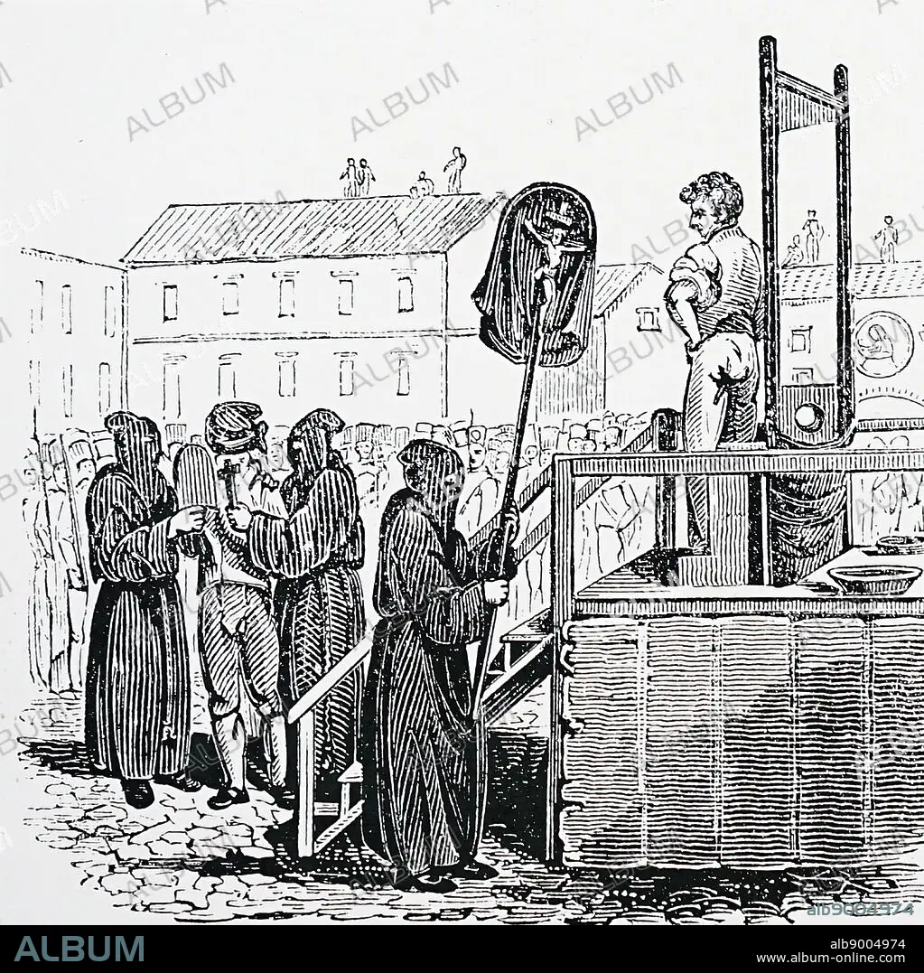 Caption: Illustration depicting a condemned man being led to his execution at the guillotine. Dated 19th Century