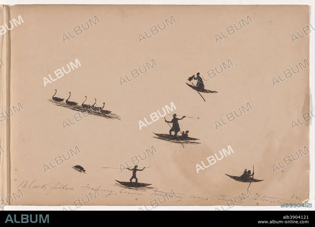 Caption: Black fellows fishing, swan hunting and turtle hunting-Sketchbook of Aboriginal activities. Date/Period: Ca. 1890s. Drawing. Height: 238 mm (9.37 in); Width: 360 mm (14.17 in).
