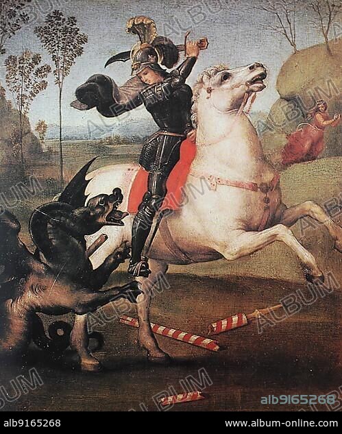 St. George Fighting the Dragon, by Raffaello Sanzio da Urbino, also Raphael da Urbino, Raffaello Santi, Raffaello Sanzio, Raphael, Italian painter, Italy, digitally restored reproduction of a work of art (public domain) from c. 1500