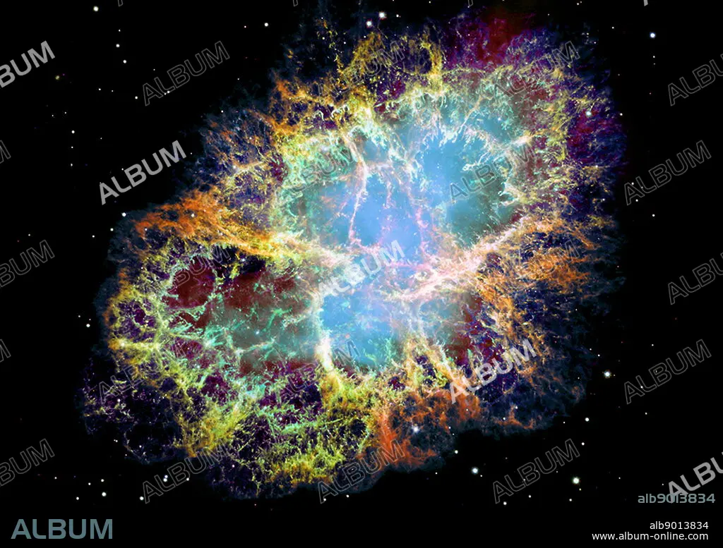 mosaic image, one of the largest ever taken by NASA's Hubble Space Telescope of the Crab Nebula, a six-light-year-wide expanding remnant of a star's supernova explosion. Japanese and Chinese astronomers recorded this violent event nearly 1,000 years ago in 1054, as did, almost certainly, Native Americans. The orange filaments are the tattered remains of the star and consist mostly of hydrogen. The rapidly spinning neutron star embedded in the centre of the nebula is the dynamo powering the nebula's eerie interior bluish glow. The blue light comes from electrons whirling at nearly the speed of light around magnetic field lines from the neutron star. The neutron star, like a lighthouse, ejects twin beams of radiation that appear to pulse 30 times a second due to the neutron star's rotation. A neutron star is the crushed ultra-dense core of the exploded star. The Crab Nebula derived its name from its appearance in a drawing made by Irish astronomer Lord Rosse in 1844, using a 36-inch telescope. taken in October 1999, January 2000, and December 2000. The colours in the image indicate the different elements that were expelled during the explosion. Blue in the filaments in the outer part of the nebula represents neutral oxygen, green is singly-ionized sulphur, and red indicates doubly-ionized oxygen.