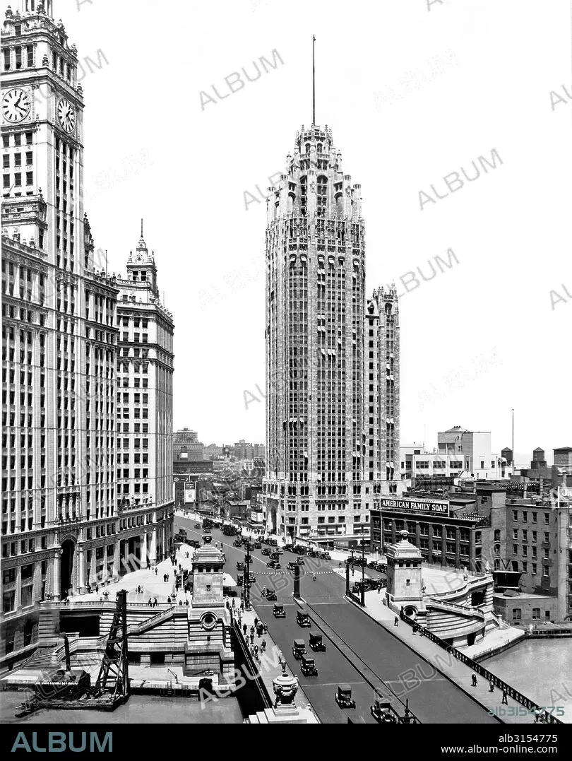 Chicago, Illinois: 1925. The Michigan Avenue Bridge and the the Wrigley (left) and Tribune (center) Buildings in Chicago, Illinois.