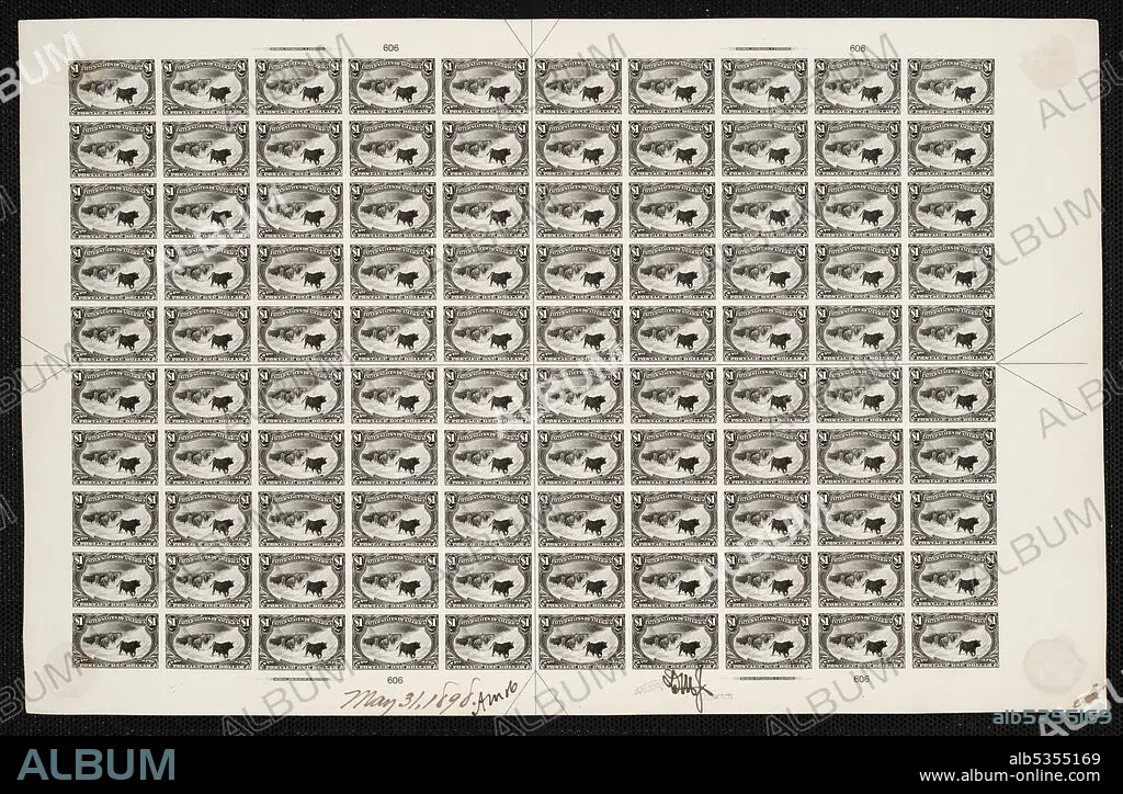 Caption: $1 Trans-Mississippi Western Cattle in Storm plate proof sheet, May 31, 1898. Certified plate proofs are the last printed proof of the plate before printing the stamps at the Bureau of Engraving and Printing. These plate proofs are each unique, with the approval signatures and date. For postal scholars these plates provide important production information in the plate margin inscriptions, including guidelines, plate numbers, and initials of the siderographer, or person who created the plate from a transfer roll.;Plate No. 606;Denomination: $1;Subject: Trans-Mississippi Exposition, Western Cattle in Storm;Color: black.