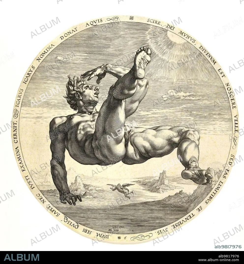 Caption: Icarus or Ikaros falls from the sky after his flight experiment fails; in Greek mythology the son of Daidalos; Historical; digitally restored reproduction from an original from prehistoric times