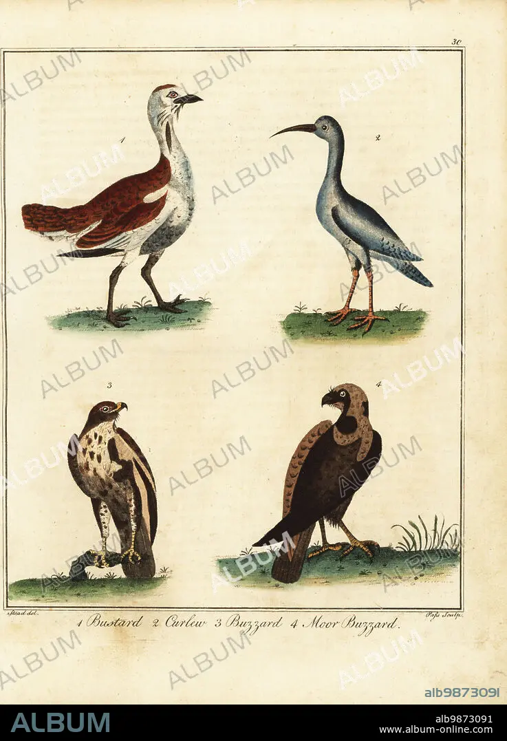 Bustard, Otis tarda, curlew, Numenius arquata, buzzard, Buteo buteo, and moor buzzard, Circus aeruginosus. Handcoloured copperplate engraving by J. Pass after an illustration by J. Stead from William Augustus Osbaldistons The British Sportsman, or Nobleman, Gentleman and Farmers Dictionary of Recreation and Amusement, J. Stead, London, 1792.