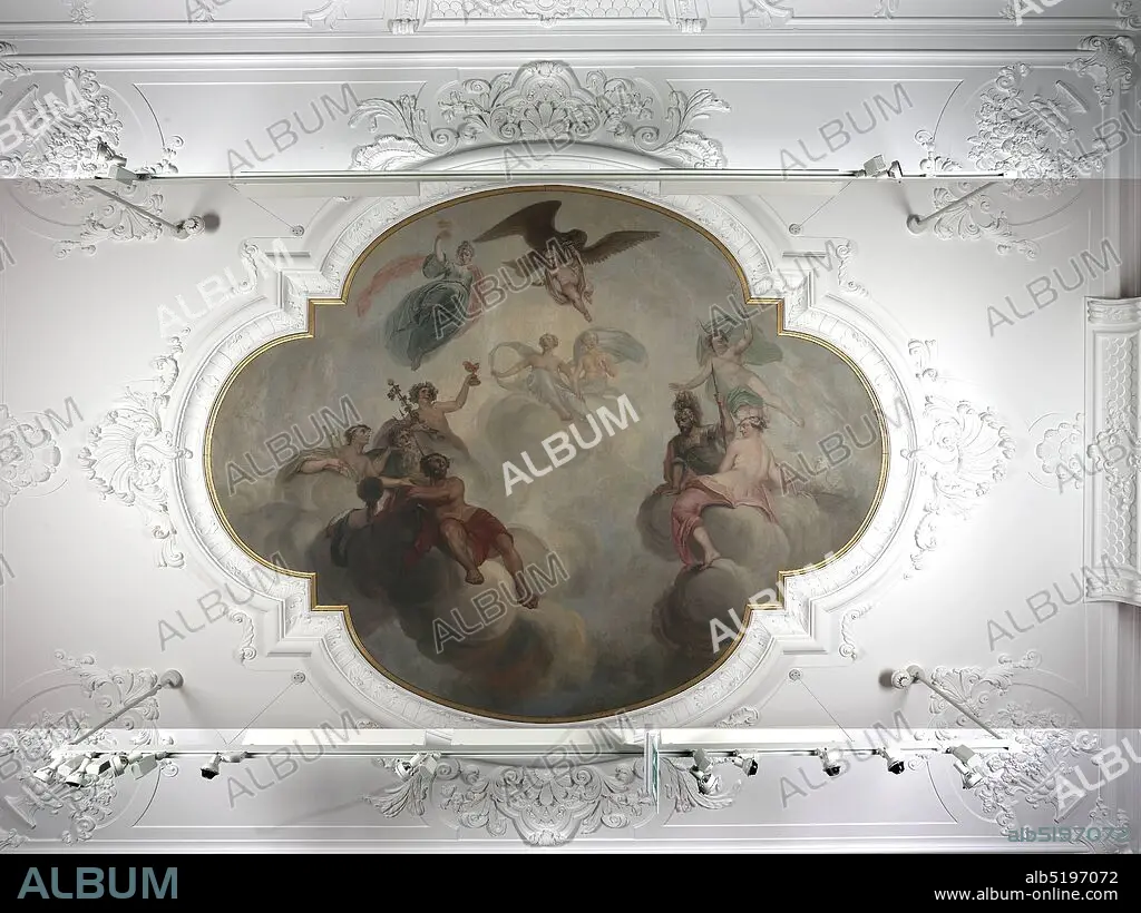 Caption: ceiling piece, Anthony Elliger, 1739, Signature front, bottom right: A. Elliger 1739, canvas, oil paint, painted, Overall dimensions according to catalog 1983: 334 × 429cm 3340 × 4290mm, eagle, minerva, mercury, neptune, boy, mythology, arnhem, Ceiling piece including the mythological representation: the robbery of Ganymede. At the top center you can see Jupiter, who has assumed the form of an eagle. He holds the young painter boy Ganymede in his mouth, which he just brought to Olympus. Underneath two figures and on the left Hebe, recognizable by the drinking bowl that she holds up in her right hand. At the bottom left a group of five figures: Apollo with the lyre, Neptune with the trident, Bacchus with the staff why a grape branch twists and a wine glass, Vulcan with the hammer and a female figure, seen from the back. At the bottom right a group of three figures: Venus probably, because without attributes, Mars with weapons and Mercury with wings and a wing staff, with two figures in the background on the right. The cloth has the shape of a four-lobed medallion, with small right angles protruding between the lobes. Signed bottom right. Ceiling piece is mounted in a plaster ceiling that covers the entire ceiling. Belongs to interior inv.nr. 2387, 1920