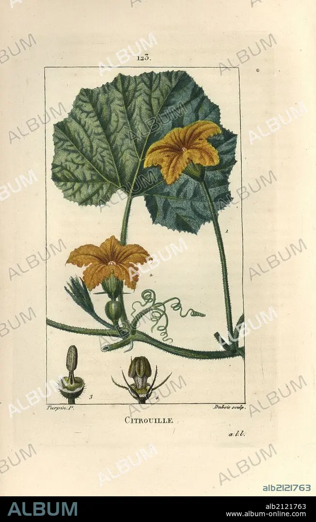 Caption: Pumpkin, Cucurbita maxima, showing flower, leaf, and tendrils. Handcoloured stipple copperplate engraving by Dubois from a drawing by Pierre Jean-Francois Turpin from Chaumeton, Poiret et Chamberet's "La Flore Medicale," Paris, Panckoucke, 1830. Turpin (1775~1840) was one of the three giants of French botanical art of the era alongside Pierre Joseph Redoute and Pancrace Bessa.
