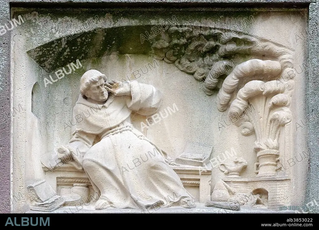Caption: Relief of Berthold Schwarz, inventor of gunpowder, Berthold Schwarz Fountain by Josef Alois Knittel, 1855, Freiburg im Breisgau, Baden-Württemberg, Germany, Europe