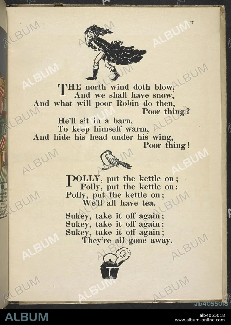 Caption: The north wind doth blow, and we shall have snow, ...' 'Polly, put the kettle on; ' . Nursery Rhymes, with pictures by C. L. Fraser. London : T. C. & E. C. Jack, [1919]. Source: 12800.ddd.31 page 17.