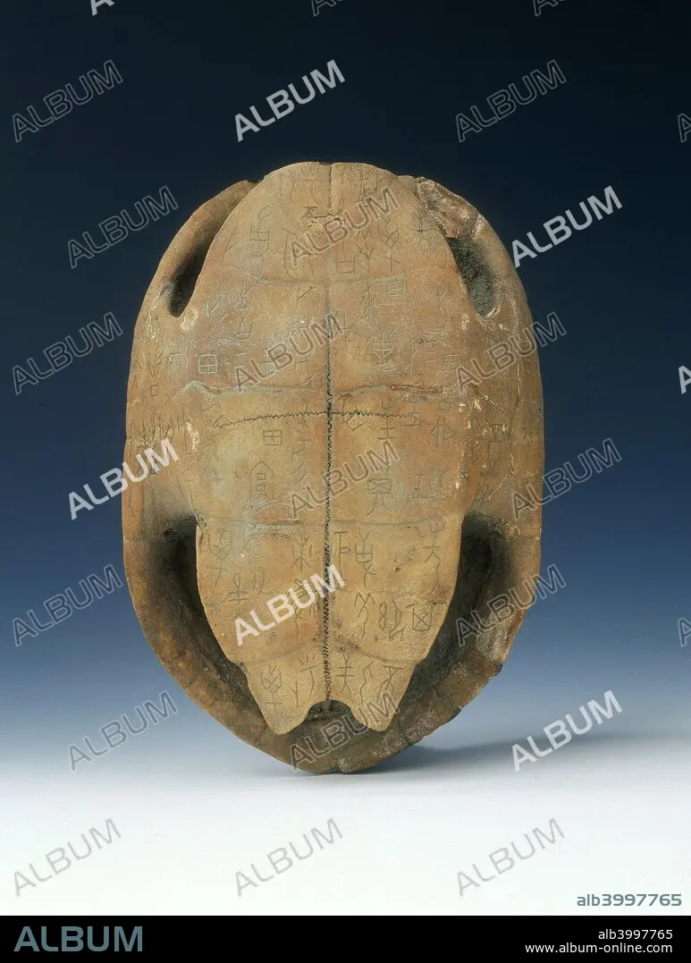 Caption: Petrified tortoise shell with oracle bone inscriptions, possibly Shang Dynasty, China, c1400 BC. A small petrified tortoise shell of pale buff colour. The base is inscribed all over with ancient oracle bone seal characters.
