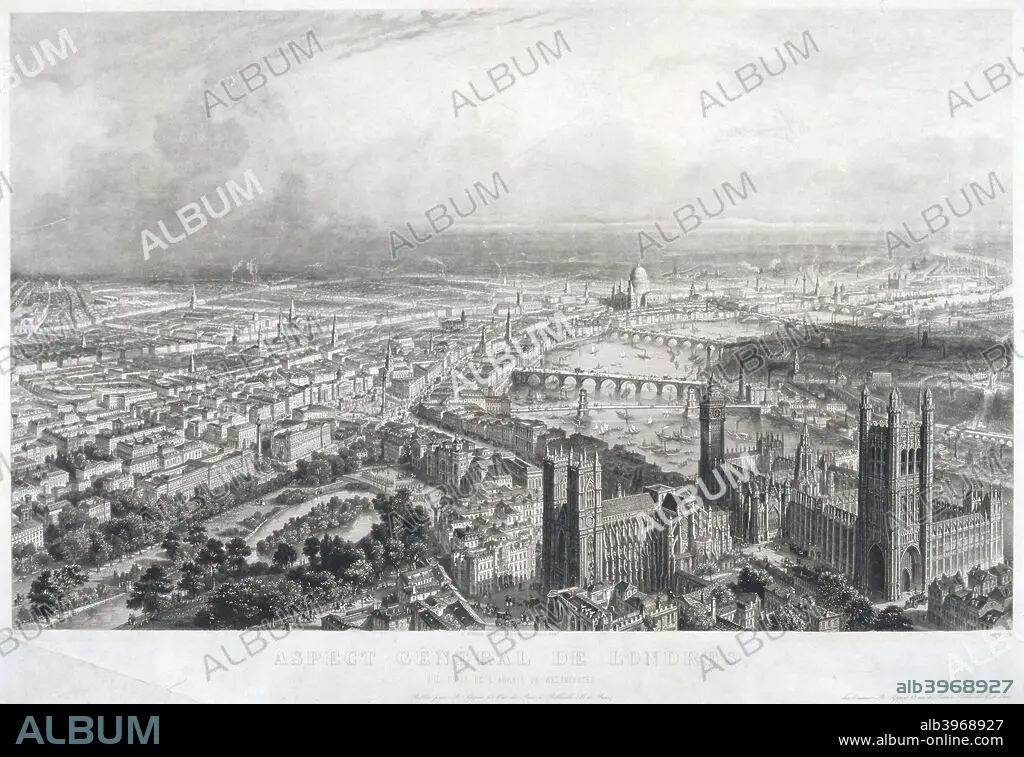 Caption: Aerial view of London, 1850. View of London looking north-east, from Westminster and showing the course of the River Thames; in the foreground are Westminster Abbey, with the Houses of Parliament on the right, which show the completed Clock and Victoria Towers and St James's Park to the left.