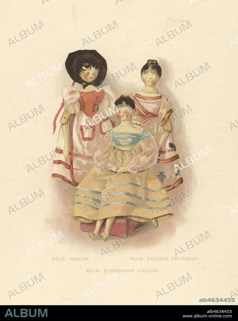 Ballet dancers Mlle. Proche Giubelei in La Sommambula, Mlle. Pauline Duvernay in Sleeping Beauty and Mlle. Euphrosine Ancilin as dolls dressed by young Princess Victoria. Color plate after an illustration by Alan Wright from Frances H. Lows Queen Victorias Dolls, George Newness, London, 1894.