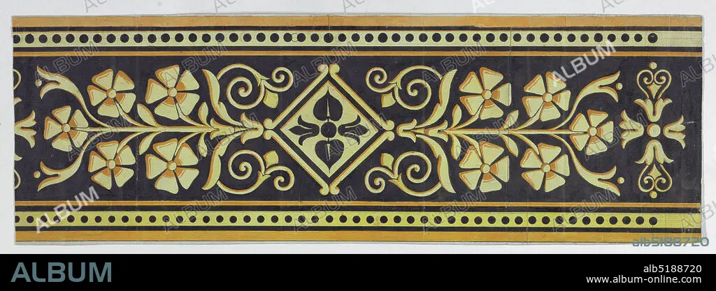 Design for a Woven Border, Pen and black ink, brush and wash, graphite on paper, Plants grow horizontally beside the lateral points of a lozenge containing two spade leaves and two calyxes growing from a bead. Motif is to alternate with another consisting of four calyxes surrounding a bead. Heart motifs grow from the upper and lower calyxes. Upper and lower framing stripes, one with row of beads., France, ca. 1810, textile designs, Drawing, Drawing
