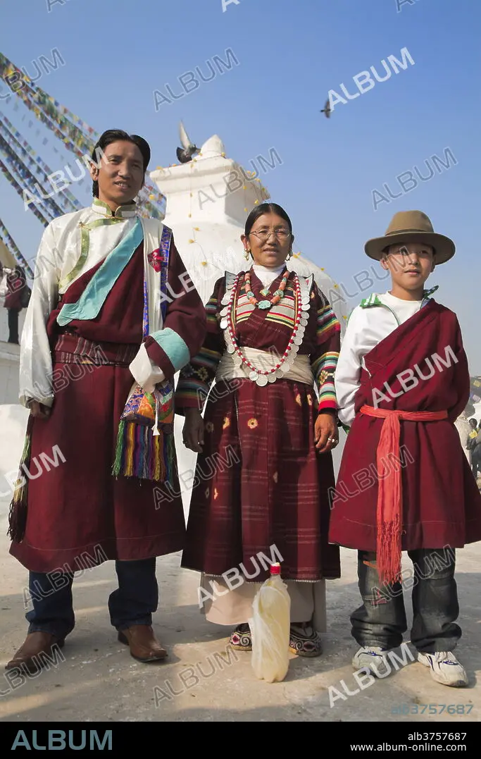 Tibetan family in traditional clothes, Lhosar Tibetan and Sherpa New Year festival, Bodhnath Buddhist stupa, UNESCO World Heritage Site, Kathmandu, Bagmati, Nepal, Asia