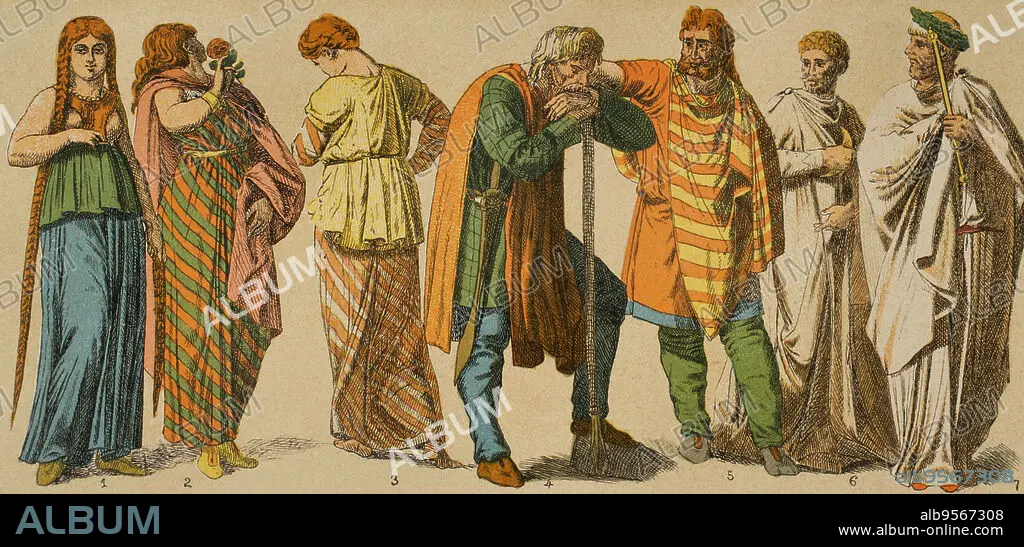 Gauls. From left to right: 1 to 3- women's Gaulish dress, 4- warrior garment, with sword fastened with chain, 5- male costume of a person of rank, 6- Gallic priest's vestment, with sacral knife, 7- pontiff. Sceptre. Chromolithography. "Historia Universal", by César Cantú. Volume II, 1881.