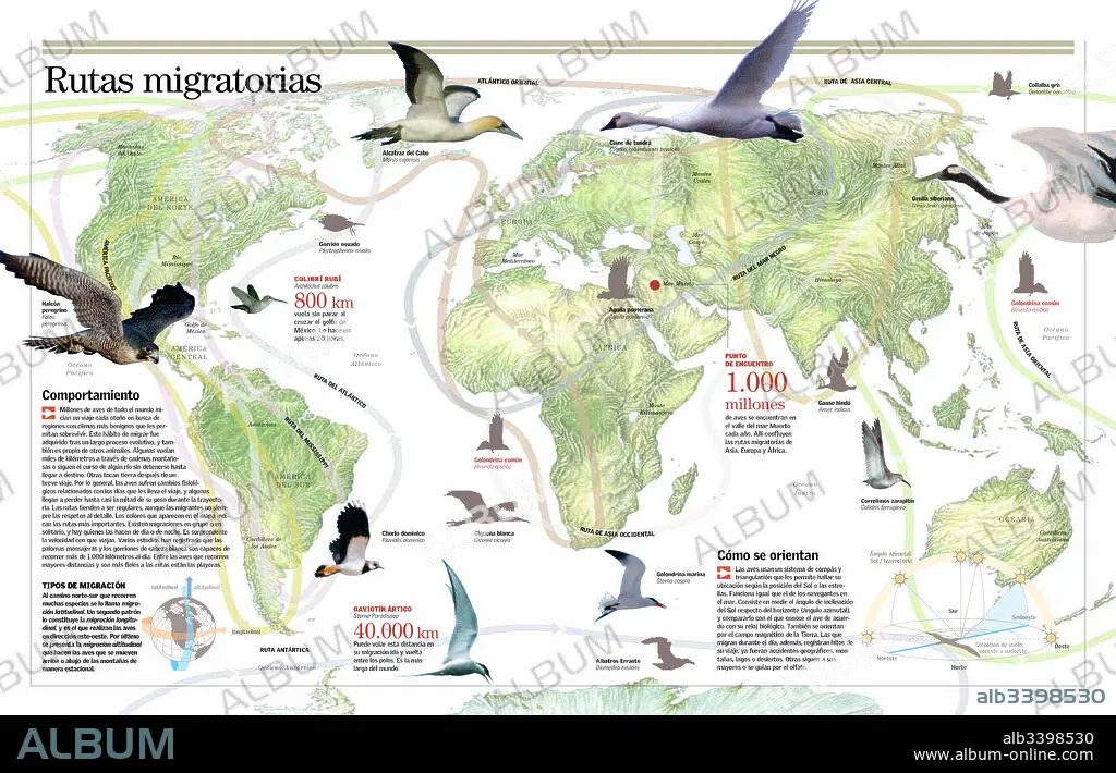 Infographic on bird migration: behavior, types, routes and guidance.