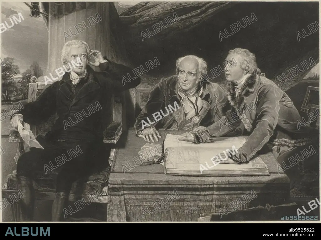 Caption: Portrait of Sir Francis Baring, with his Brother and his Son-in-Law Portrait of Francis Baring, his brother John Baring and Charles Wall The Baring Family , print maker: Edward McInnes, (mentioned on object), after: Thomas Lawrence, (mentioned on object), publisher: Henry Graves & Co., London, 1841, paper, etching, h 301 mm × w 435 mm