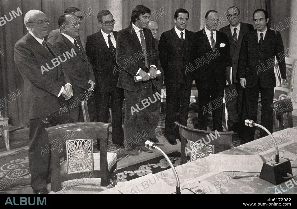 POLITICAL SIGNERS OF THE MONCLOA PACTS ON OCTOBER 25, 1977 - BLACK AND WHITE PHOTOGRAPH - 1977