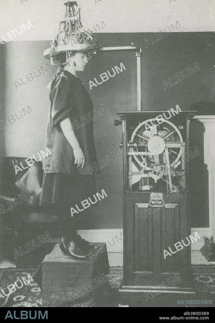 Caption: Phrenology is the science which studies the relationships between a person's character and the morphology of the skull. It is a very ancient object of study. The first philosopher to locate mental faculties in the head was in fact Aristotle. The real scientific Phrenology, which established a direct link between the morphology of the skull and the human character, was discovered by Franz Joseph Gall an Austrian physician. He was one of the first to consider the brain as the home of all mental activities. The device pictured here is the Psychograph or Phrenometer which measured 32 points to a 5 point scale ranging from deficient to very superior. Photograph originally captioned: You ought to have your head examined. Antique phrenology machine, 1905 .