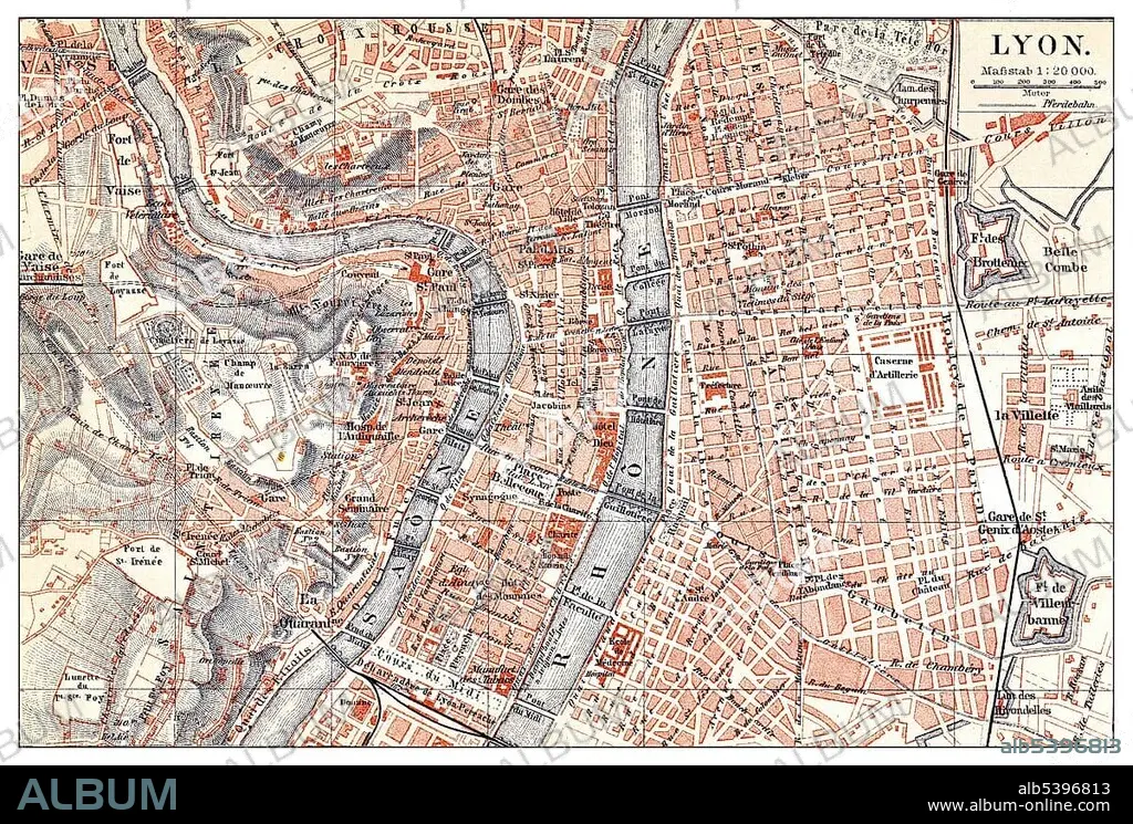 Caption: Historical map of Lyon, France, 19th century, from Meyers Konversations-Lexikon encyclopaedia, 1890, Europe
