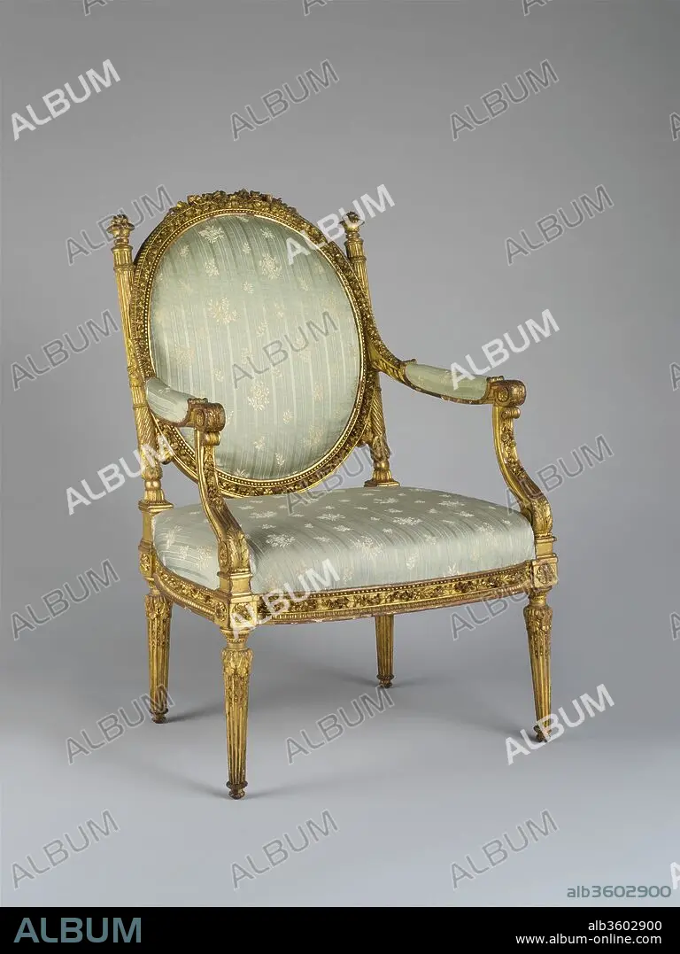 This armchair with a medallionshaped back surmounted by a rippled bowknot, its columnar uprights surmounted by finials shaped like flaming cassolettes, seems to be depicted in two paintings by Adelaide Labille-Guiard (1749-1803). Principal painter to "Mesdames Tantes," the unmarried aunts of Louis XVI, Labille-Guiard exhibited a full-length portrait of Madame Adelaide at the Salon of 1787. The princess stands in front of the chair, her robe draped over its arm. Three years later the artist painted Charles-Roger, prince de Bauffremont (1713-1795), seated in what seems to be the same chair. In both portraits it is upholstered in blue-green velvet. Since no other armchair of this model is known, it is possible that this very piece of seat furniture once belonged to Madame Adelaide. According to Eleonore-Charlotte-Adelaide-Louise d'Osmond, comtesse de Boigne (1781-1866), whose mother had been a lady-inwaiting to the princess, she was considered the cleverest of the Mesdames Tantes. She hated wine and strongly objected to the common habit of spitting, becoming enraged if anyone spat in her presence. She never married, preferring to keep her position as a Daughter of France. Together with her sister Victoire, Madame Adelaide ordered fashionable furnishings for the Chateau de Bellevue, their country residence overlooking the Seine, which had formerly belonged to Madame de Pompadour.