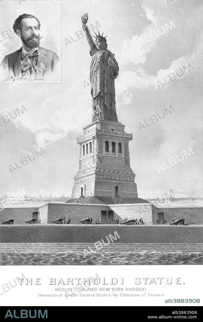 Caption: Vintage architecture print showing The Statue of Liberty and a portrait of it’s sculptor, Frederic Auguste Bartholdi. It reads, The Bartholdi Statue. Bedloe’s Island New York Harbor. Presented to the United States by Citizens of France.