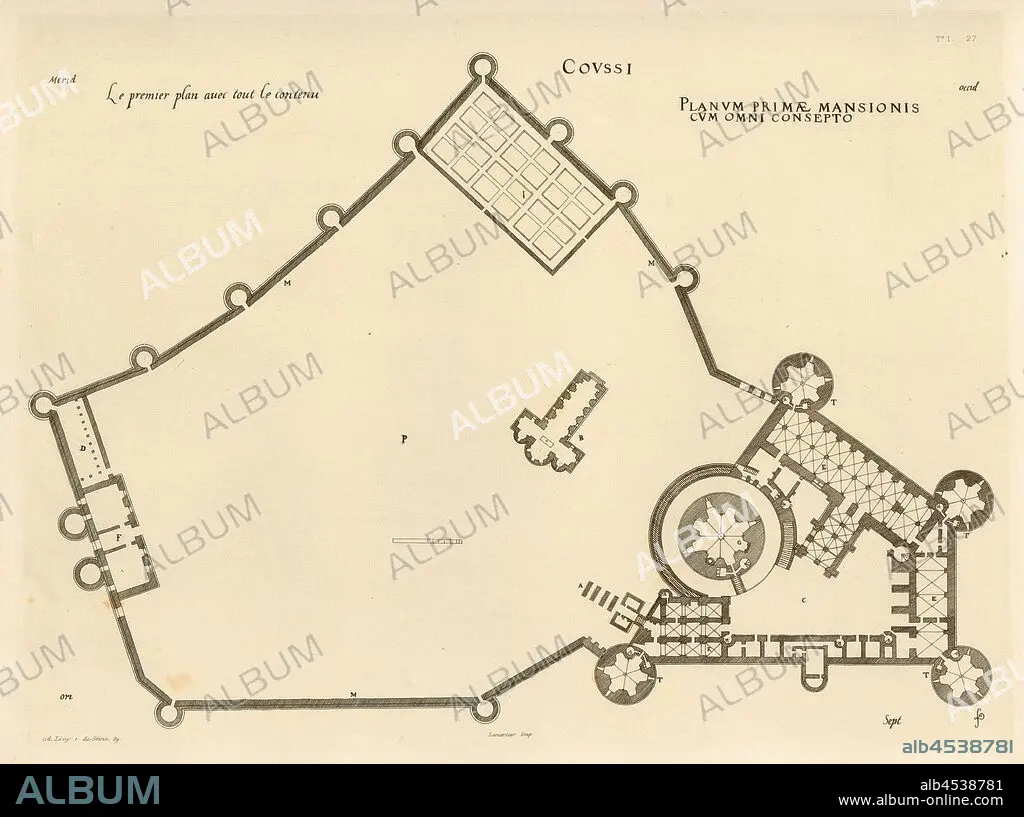 Caption: Coussi. The foreground with all the content, Floor plan of the Château de Coucy at Coucy-le-Château-Auffrique (France), Signed: FD; Imp. Lemercier; A. Levy, Fig. 28, T. 1. 27., Cerceau, Jacques Androuet du (del.); Faure-Dujarric, Pierre-Lucien (sc.); Imprimerie Lemercier (imp.); Levy, A. (ed.), 1868, Jacques Androuet du Cerceau; Hippolyte A. Destailleur: Les plus excellents bastiments de France. Paris: A. Lévy, Libraire-Editeur, M DCCC LXVIII - M DCCC LXX. [1868-1870]