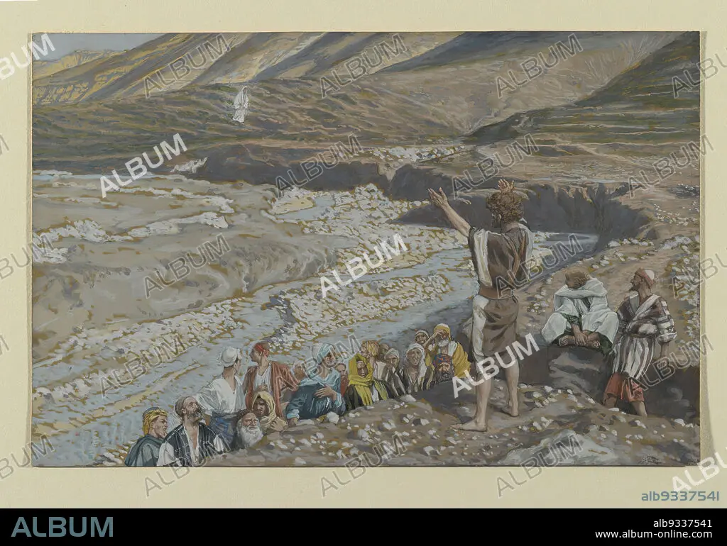Saint John the Baptist Sees Jesus from Afar, Saint Jean-Baptiste voit Jésus de loin, The Life of Our Lord Jesus Christ, La Vie de Notre-Seigneur Jésus-Christ, James Tissot, French, 1836-1902, Opaque watercolor over graphite on gray wove paper, France, 1886-1894, Image: 6 x 9 1/4 in., 15.2 x 23.5 cm, 19th century, audience, baptism, bible, christian, christianity, crowd, desert, disciples, france, illustrations, Jesus, John 1:34-36, John the Baptist, john the baptizer, looking, new testament, ocean, painting, parable, preacher, prophet, recognition, religion, river jordan, sermon, tissot, waterpaint, wilderness