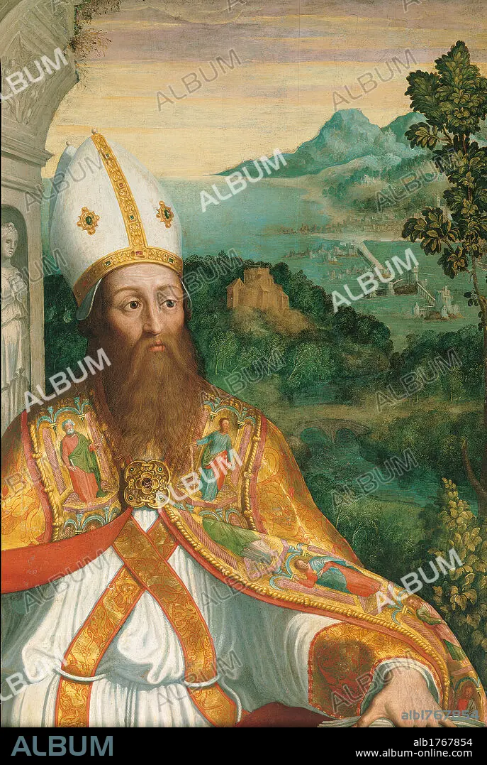 Caption: Italy, Lombardy, Milan, Santa Maria presso San Celso Church. Detail. St Renatus man beard bishop tiara surplice stole tippet cope pin landscape woods forests mountains white red gold green.