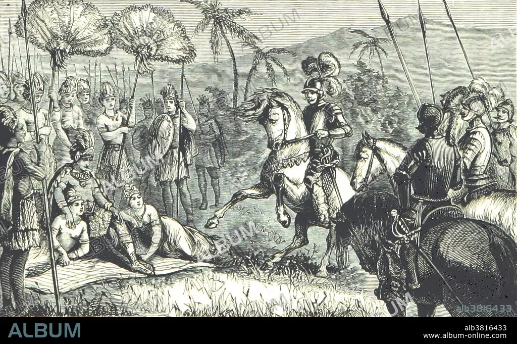 Hernando de Soto (1496/98 - May 21, 1542) was a Spanish explorer and conquistador. He explored and colonized Panama, Nicaragua, Honduras and Peru, where the expedition, led by Francisco Pizarro, conquered the Incan Empire. In 1536 de Soto returned to Spain a rich man due to the gold stolen from the Incas. In 1537 the King of Spain granted him the rights the conquer Florida. He led the first European expedition deep into the territory of the modern-day United States, thus becoming the first European documented to have crossed the Mississippi River. A vast undertaking, de Soto's North American expedition ranged throughout the southeastern United States searching for gold and a passage to China. De Soto died in 1542 on the banks of the Mississippi River in Arkansas or Louisiana. Engraving taken from page 8 of "The Land of the Incas and the City of the Sun; or the story of Francisco Pizarro and the conquest of Peru" by W.H. Davenport Adams, 1885.