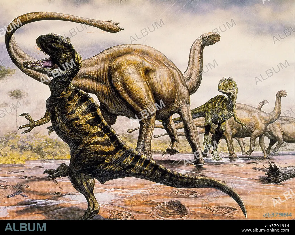 Caption: Yangchuanosaurus (Metriacanthosaurus), a carnivorous theropod dinosaur (left) and Shunosaurus, a sauropod (right) from the Cretaceous era of Asia.