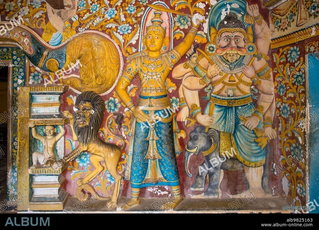 Caption: Old murals and sculptures inside the caves of the Buddhist temple and monastery Mulkirigala Raja Maha Vihara. The complex exist since 1500 years and is the most important cultural-historical temples of the region