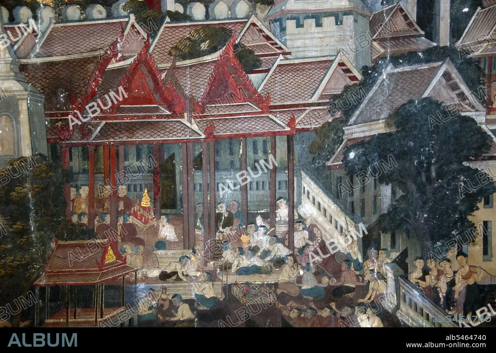 Title: Thailand: Mural showing a Buddhist religious ceremony in the main vihan at Wat Ratchapradit, Bangkok