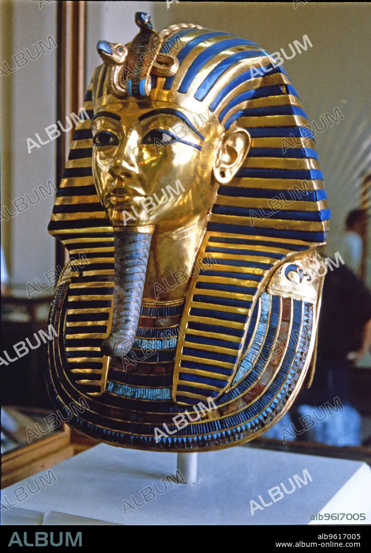 Caption: Tutankhamun death mask made of solid gold encrusted with precious stones, found by H. Carter in 1922.