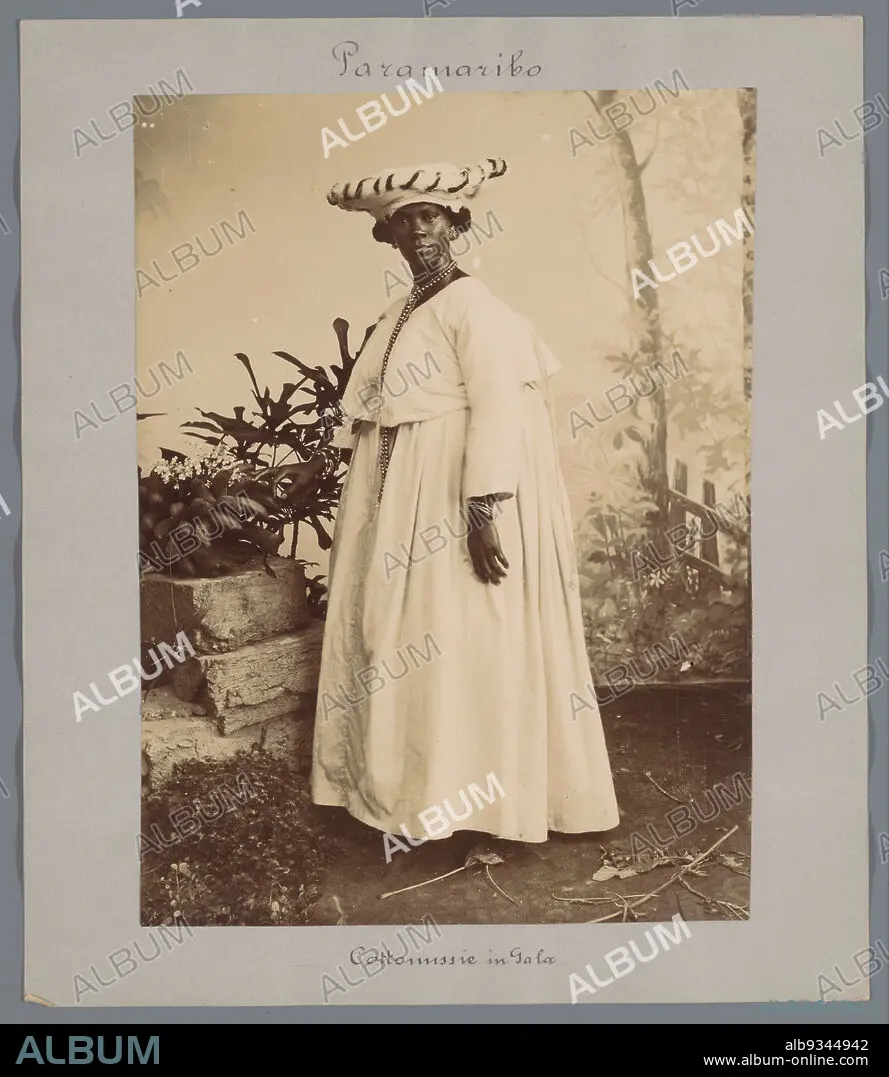 Caption: Cottomission in Gala (title on object), Portrait of a standing Surinamese woman in kotomisi. Standing near a fruit still life in front of a backdrop in the photo studio. Part of a group of 44 photographs of Paramaribo, Suriname and Curaçao, ca. 1900-1905, mounted on cardboard and inscribed., Eugen Klein, Paramaribo, 1900 - 1905, photographic support, cardboard, height 227 mm × width 166 mm