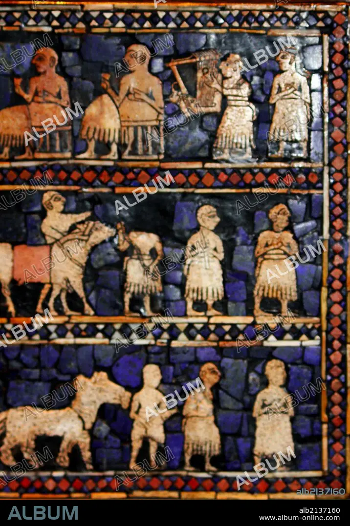 Title: Detail from the Standard of Ur (Peace side). Sumerian artefact (circa 2600 BC) excavated from the royal tomb in the city of Ur in the 1920's. South of what is now Baghdad in Iraq. It is an historical account of ancient warfare, and shows a king, subjects, musicians, soldiers and animals