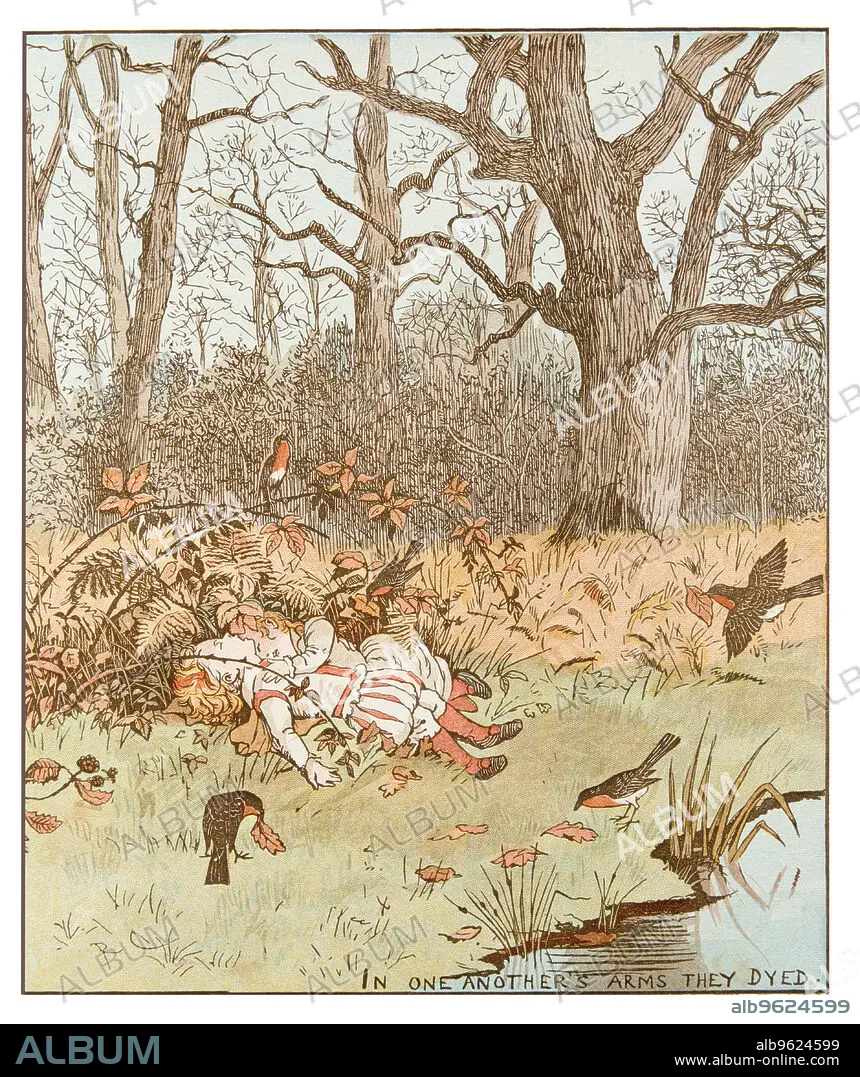 Caption: Scene from The Babes in the Wood, 1878. No burial these prettye babes/Of any man receives./Till Robin-redbreast painfully/Did cover them with leaves. The Babes' uncle had paid two ruffians to murder them. One of the villains had a change of heart, murdered his accomplice and let the children go. They wandered through the woods until they died of exposure. A ballad of c1600 tells the story of the owner of Wayland Hall, Norfolk, who died leaving his infant son and daughter in the care of his brother. If both children should die before the uncle he would inherit their wealth. After a year, greed overcame duty and family affection. From The Babes in the Wood, published by Frederick Warne and Co. (London, 1879).