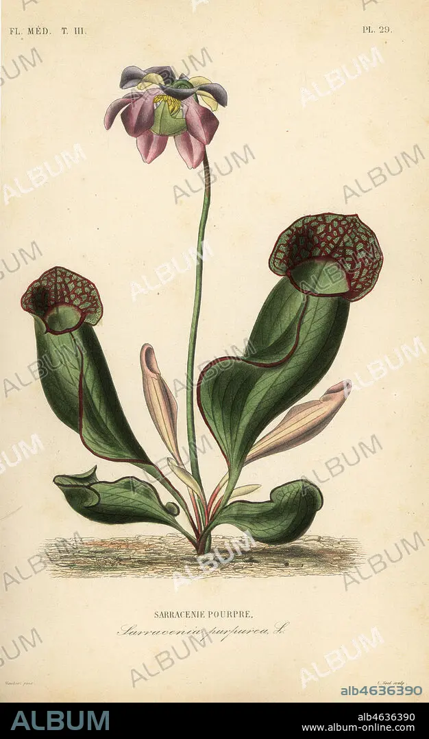 Purple pitcher plant or side-saddle flower, Sarracenia purpurea, Sarracenie pourpre. Handcoloured steel engraving by Alphonse-Leon Noel after a botanical illustration by Edouard Maubert from Pierre Oscar Reveil, A. Dupuis, Fr. Gerard and Francois Herincqs La Regne Vegetal: Flore Medicale, L. Guerin, Paris, 1864-1871.