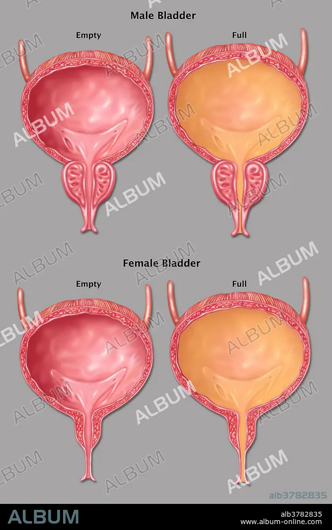 Caption: Illustration of a empty (left) and full (right) male (top) and female (bottom) bladders.