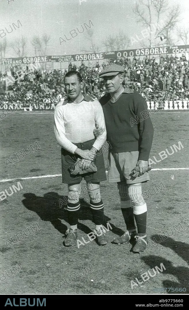 Caption: 1950. Charity Party (III). Charity Party (III). - charity soccer match between Bullfighters and Soccer Players played at the Sevillista field in Nervión in the early 1950s. In the image, two legendary goalkeepers in Spanish soccer: the Sevillista Guillermo and Izaguirre "the Flying Angel", and Ricardo Zamora. (Gelán photo)