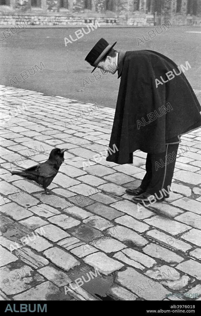 Caption: Beefeater bending down to address a raven, Tower of London, Tower Hill, London, late 1930s.