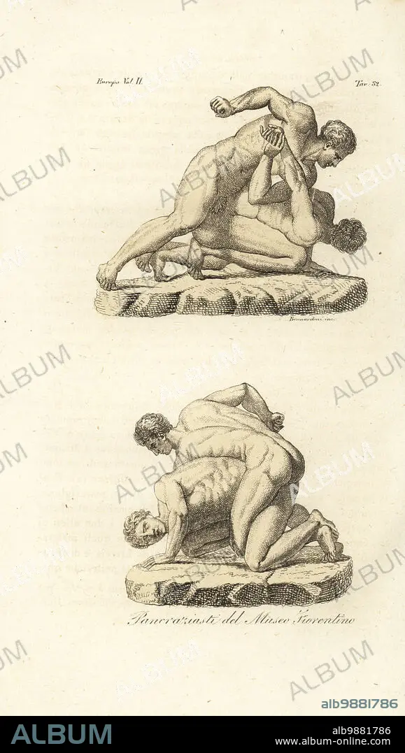 Greek athletes competing in the martial art of Pankration. After the Pancrastinae statue of Pankratiasts in the Florentine Museum (now in the Uffizi). Pancraziasti del Museo Fiorentino. Handcoloured copperplate engraving from Giulio Ferrarios Costumes Ancient and Modern of the Peoples of the World, Il Costume Antico e Moderno, Florence, 1826.