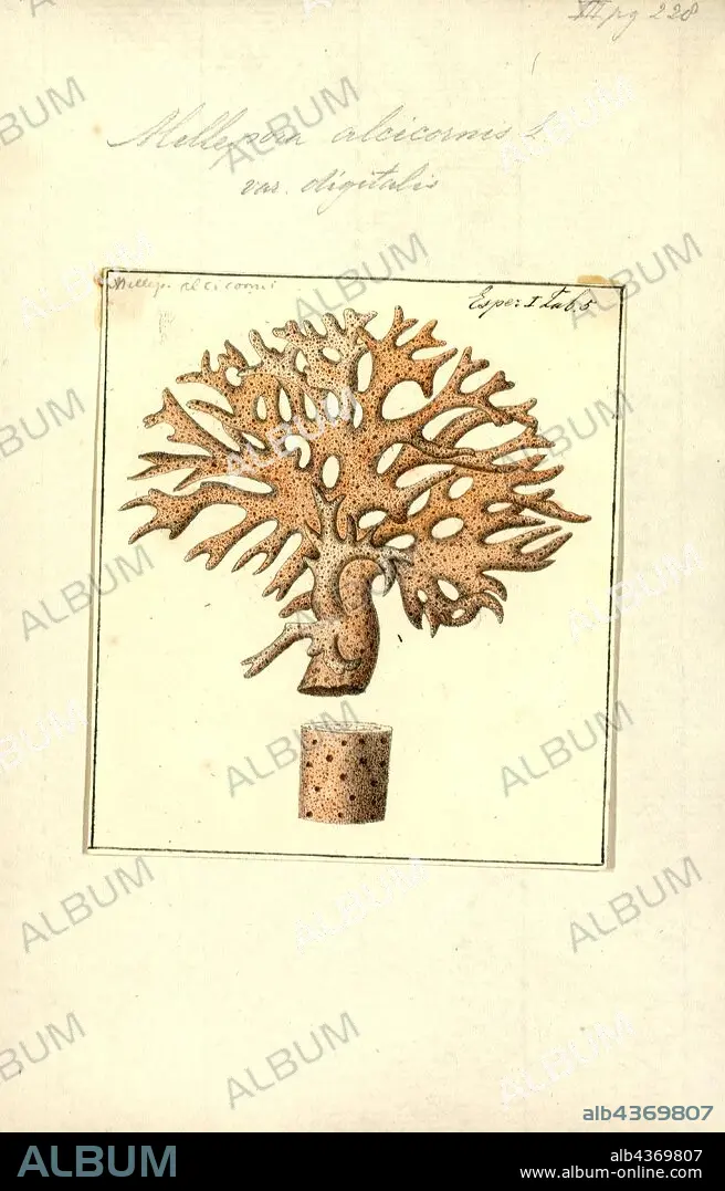 Caption: Millepora alcicornis, Print, Millepora alcicornis, or sea ginger, is a species of colonial fire coral with a calcareous skeleton. It is found on shallow water coral reefs in the tropical west Atlantic Ocean. It shows a variety of different morphologies depending on its location. It feeds on plankton and derives part of its energy requirements from microalgae found within its tissues. It is an important member of the reef building community and subject to the same threats as other corals. It can cause painful stings to unwary divers.