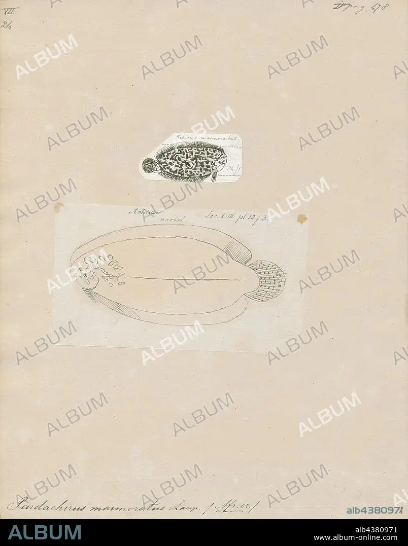 Pardachirus marmoratus, Print, Pardachirus marmoratus, also known as the finless sole, the speckled sole or the Red Sea Moses sole, is a small fish from the Red Sea that secretes an ichthyotoxic milky substance from the base of its dorsal and anal fins. This secretion contains pardaxin, a lipophillic peptide that causes severe plasma membrane disruption resulting in cell leakage. The pardaxin containing secretion is used as a defensive mechanism against predators including sharks. Pardaxin is irritating to predator fish, particularly affecting the sensitive gills. Dr. Eugenie Clark conducted much of the early work on Pardachirus marmoratus., 1700-1880